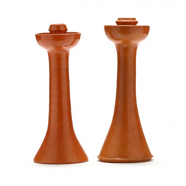 From the Estate of the late Earl and Fran Senger, Greensboro, North Carolina One stick with 6 in. hairline upwards from base and both with multiple chips and flakes; smaller bowl with original potting defect to the rim; larger bowl with upper rim chip.