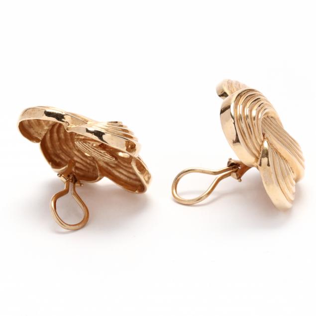 Ribbed Celtic knot form earrings, completed with omega clip backs, stamped 14K.