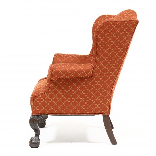Attributed to the Southeastern Virginia region, circa 1900, over upholstered frame with shaped crest and shaped wings, distinctive and bold cabriole front legs with acanthus carved knee and robust ball and claw foot, down-swept rear legs.