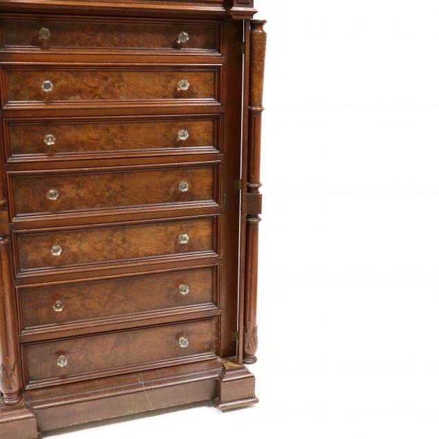 Circa 1870, one part form, plinth form crest with applied molding, arched front with bronze cherub frieze, seven graduated molded drawers with burl walnut veneer, fully turned and fluted columns to each stile (the right stile hinged to create lock-side mechanism), paneled sides, molded and stepped base on casters.