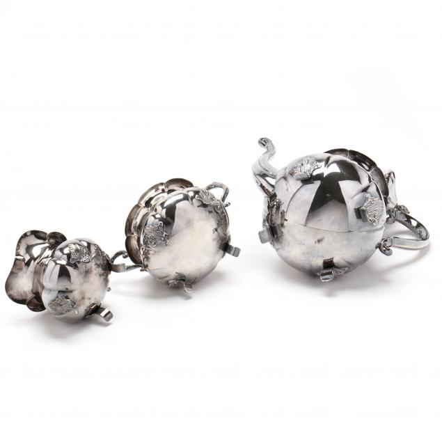 Mark of David Andersen, circa 1925, bulbous reeded waist and everted rim, foliate scroll feet, including a coffee pot (9 in.), a sugar (3 1/2 in.), and creamer (3 1/2 in.), all with matching monogram.