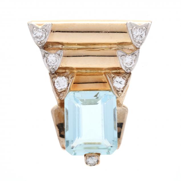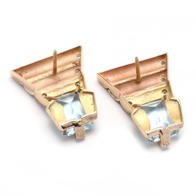 To include an enhancer / slide designed in a geometric and ribbed motif and set to the sides with full cut round diamond accents weighing approximately .66 total carat (H-I color, SI2-I1 clarity) above a cushion cut aquamarine (24.0 x 20.0 x 12.2 mm) weighing approximately 36.0 carats, testing 14KT; earrings en suite set with an emerald cut aquamarine (13.1 x 10.5 x 6.54) and (12.7 x 10.7 x 6.93 mm) weighing approximately 13.0 total carats and diamonds weighing approximately .92 total carat (H-I color, SI1-SI2 clarity), completed with threaded posts and push backs (missing one push back), testing 14KT.