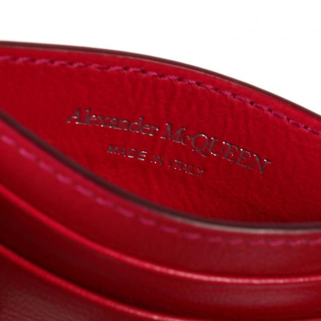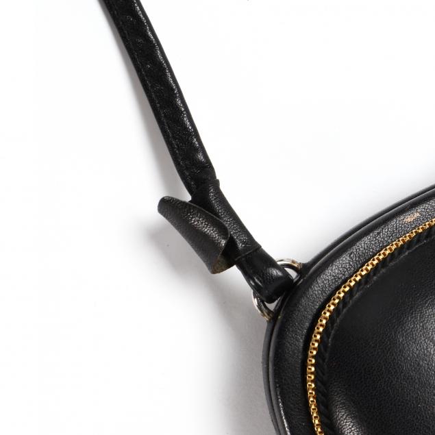 Two Juicy Couture bags, black leather, the first is a lozenge shape with an antique brass link handle from which dangle numerous charms (5 x 11 x 3 in.) and the second is a cross body with a snap closure, lock and key motif (5 3/4 x 5 3/4 in.). The third item is an Alexander McQueen 'hot' pink leather card holder with applied skull; fourth is a Ferragamo heart shaped coin purse, and fifth is an Italian design Coccinella leather cross body bag set with polished stones and applied braiding (several stones missing and light marks to the leather below the handle.)