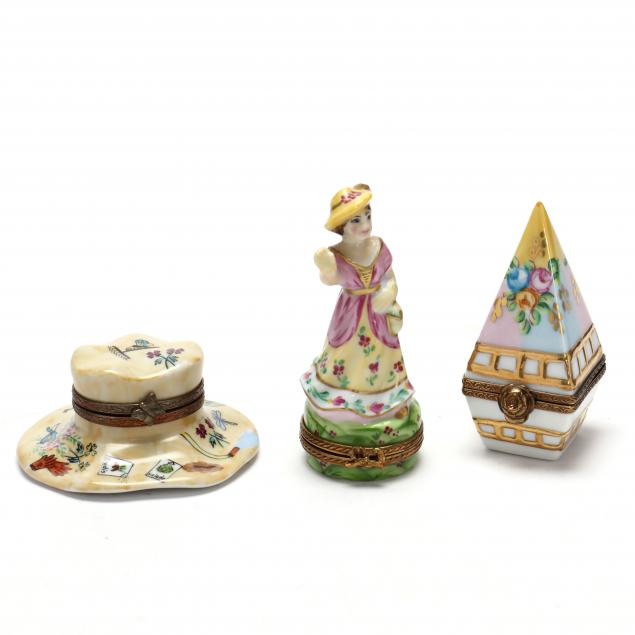 All with a floral or vine motif, featuring a lady in 19th century attire (3 1/4 in.); a gardening hat (1 1/2 x 2 3/4 in.) a mailbox, a bird house and a bird cage (2 5/8 in.).