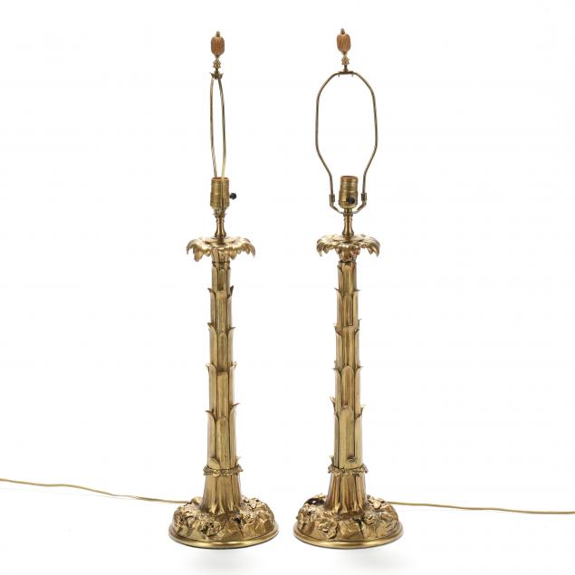 20th century, nicely cast as gathered palm stalk columns above a round ivy and rockwork base, iron weighted and felt underside, unmarked, likely lacquered, includes shades.