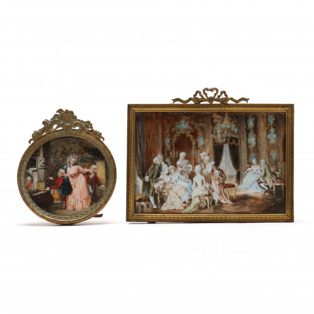 Late 19th century, watercolor on ivory, the first after Philibert-Louis Debucourt's 1786 work "Les Deux Baisers" (The Two Kisses), illegibly signed to lower right (frame size 5 1/2 x 4 1/2 in.); the second depicting courting figures within an French Rococo salon interior, unsigned (frame size 5 1/2 x 7 3/4 in.), both presented behind glass in brass frames.