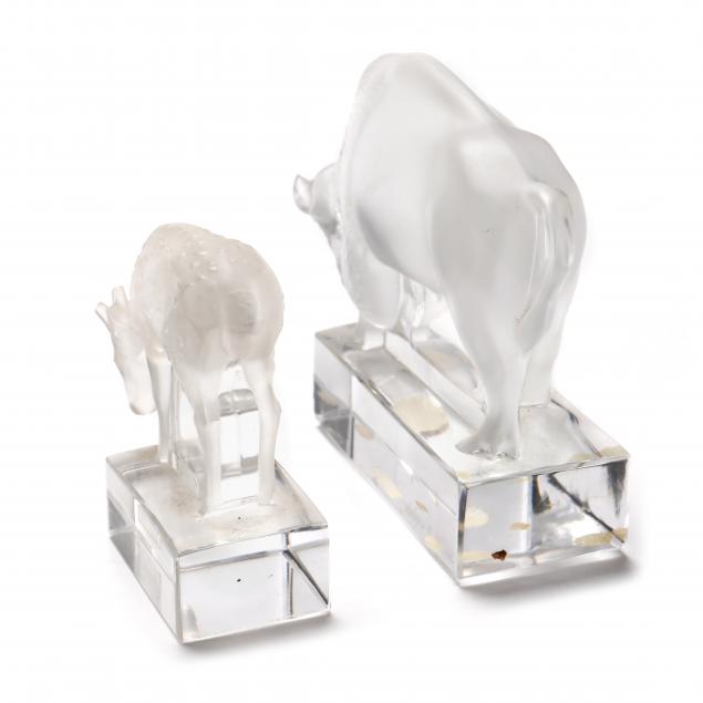 France, late 20th century, including a purple Baccarat butterfly, amber colored Baccarat butterfly, a Lalique crystal bison, and a Lalique crystal deer, all signed (the butterflies with their boxes).
