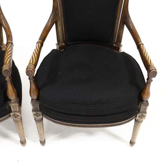 Late 20th century, carved wood frames with black upholstery, loose cushion, fluted and spiral twist arms with baluster supports, tapered turned legs.