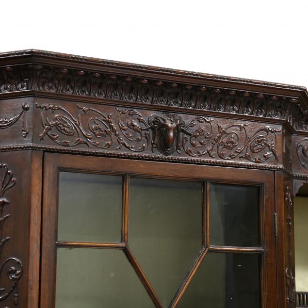 Circa 1900, two part form, mixed wood secondary, upper case with a projecting relief carved cornice, relief carved swag and foliate frieze with central ram's head over a single hinged glazed door with shelved interior, flanked by open shelves with light green silk paneled back, the base with relief carved edge, three relief carved foliate motif drawers with cock beading raised on six tall square tapered legs with relief carved bellflowers and spade feet.