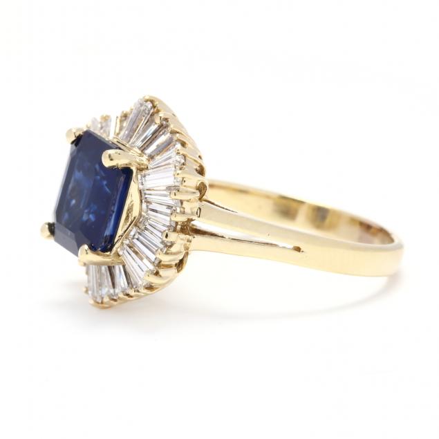 Centered on an emerald cut sapphire (9.32 x 8.21 x 5.37 mm) weighing approximately 4.29 carats, in a surround of tapered baguette cut diamonds weighing approximately 1.71 total carats (I-J color, SI2-I2 clarity), stamped 18K.