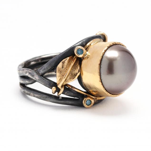Featuring a Tahitian pearl (12.7mm) bezel set in gold with gold vine motif with round cut blue diamond accents, on a silver vine twist shank, testing silver and high karat gold.