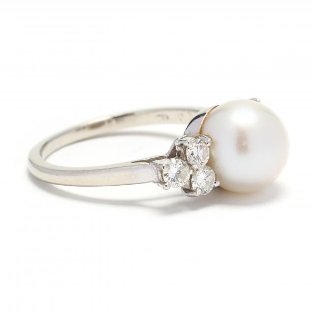 Centering on a near round cultured pearl (9mm) and with full cut round diamonds weighing approximately .48 total carat (H-I color, SI1-SI2 clarity) set to the shoulders, stamped 14K.