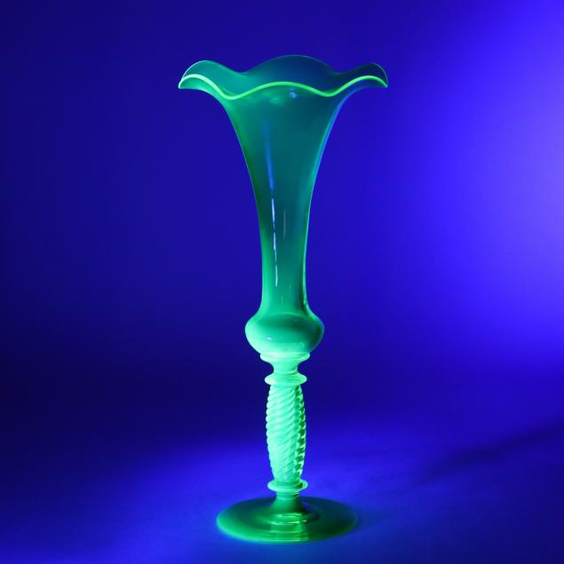 Circa 1900, trumpet vase form with spiral twist standard on a conical foot, polished pontil, unmarked.