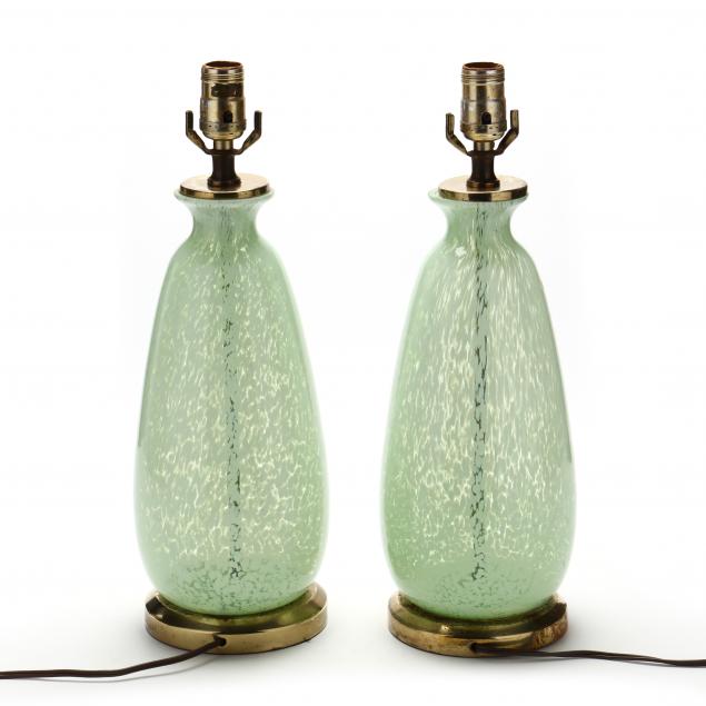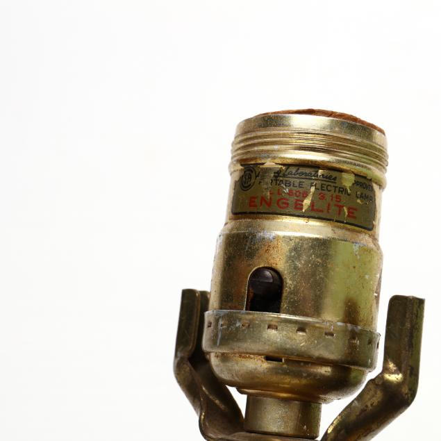 Mid 20th century, the sockets labeled Engelite, teardrop form in pale green with speckled pattern, brass mounts.