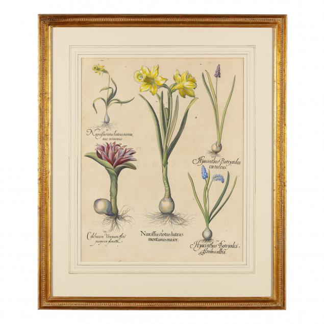 Hand-colored engravings, 1613, possibly printed 18th century, to include "...Hyacinthus Stellatus..." and "...Narcissus Totus Luteus...," in uniform matting and framing.