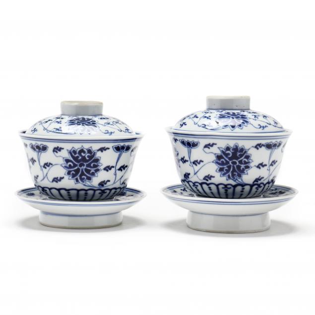 Guangxu period (1875-1908), includes a pair of bowls with covers and cup stands, each painted in underglaze blue to the exterior with six lotus blossoms with foliate scrolling vines, the interior centered with a lotus medallion, the base with a six-character mark Guangxu mark in underglaze blue.