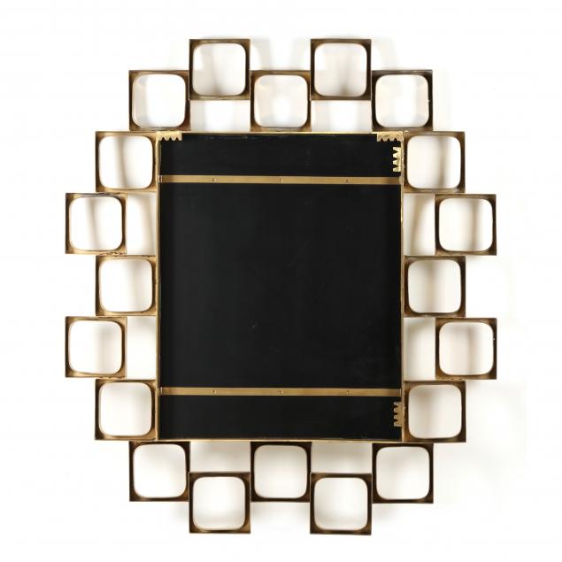 Metal with brushed brass finish, frame comprised of staggered pierced square pattern, surrounding a central rectangular beveled mirror, unsigned.