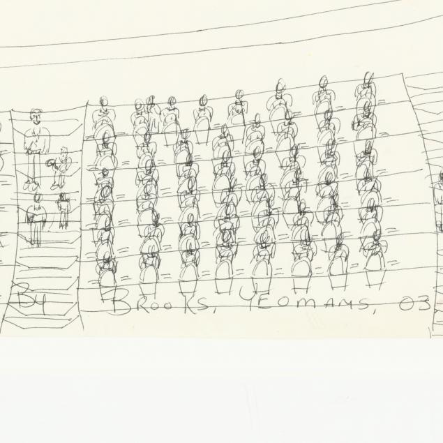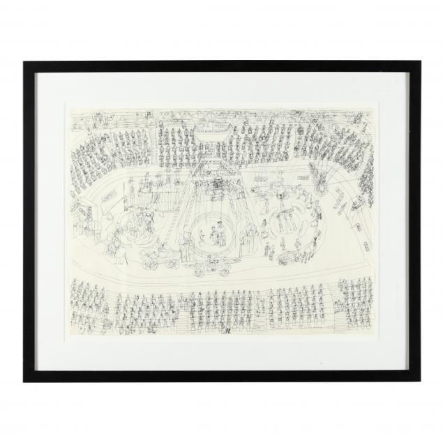 From the Estate of the late Linda Kornberg, Chapel Hill, North Carolina Brooks Yeomans was born in Cleveland County, North Carolina with a slight intellectual disability. Encouraged by his family to pursue his interest in art, he developed a talent for detailed panoramic views of events, rooms, and experiences.
