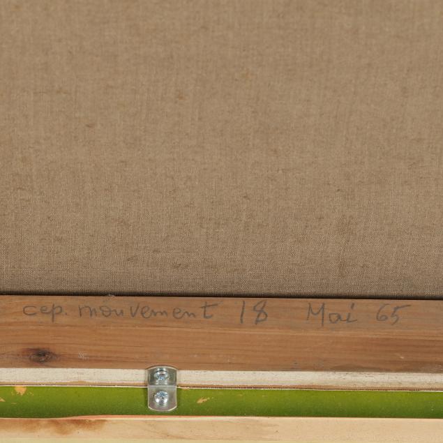 Oil on canvas, signed lower left, stretcher inscribed with title and dated 1965, artist atelier stamp to cross-brace, presented in a later gilt frame.