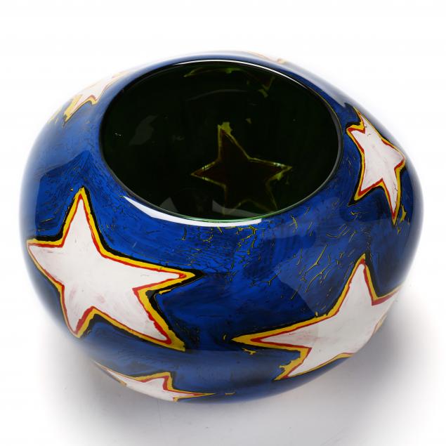 1998, blown case glass with banded stars on a blue field, green interior, polished pontil, signed and dated.