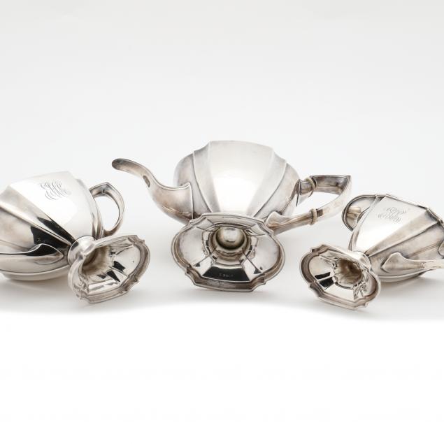 Private Collection, Durham, North Carolina Some scattered scratches and small dents; creamer with mis-shaping to foot; sugar with tear to finial.