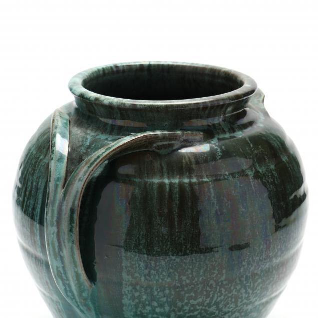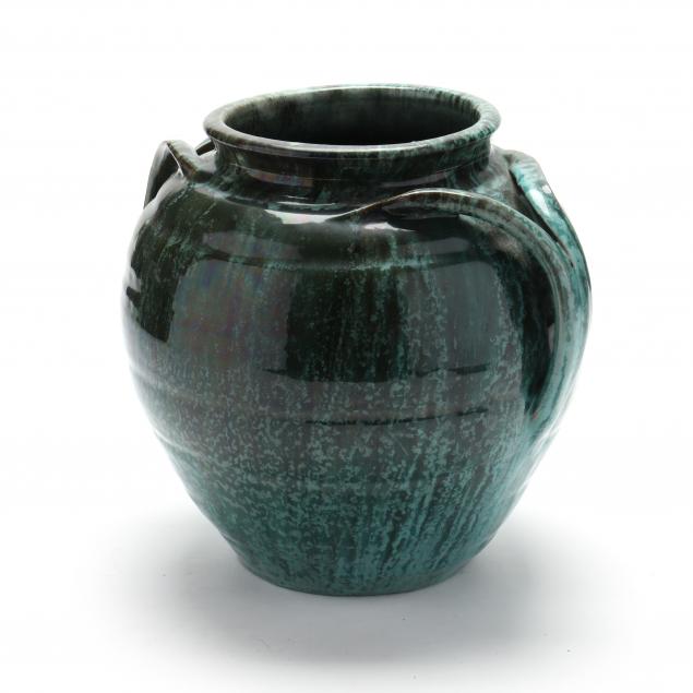J.B. Cole Pottery, stunning malachite glazed earthenware, tapered form with dual split handles, not signed.