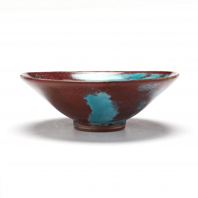 Late 1920s, Chinese Blue glaze strikingly variegated with wine red, raied on a short recessed unglazed foot with Jugtown stamp.