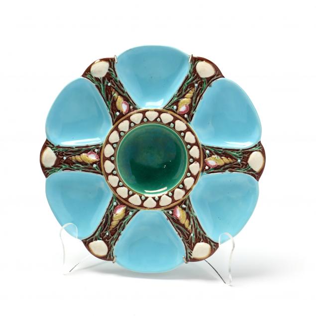Late 19th century, (3) by unidentified makers are hand-painted with an oyster in each well, (good condition); the 4th plate is English and stamped Minton, decorated in relief with various shells (several glaze flakes to the enter well).