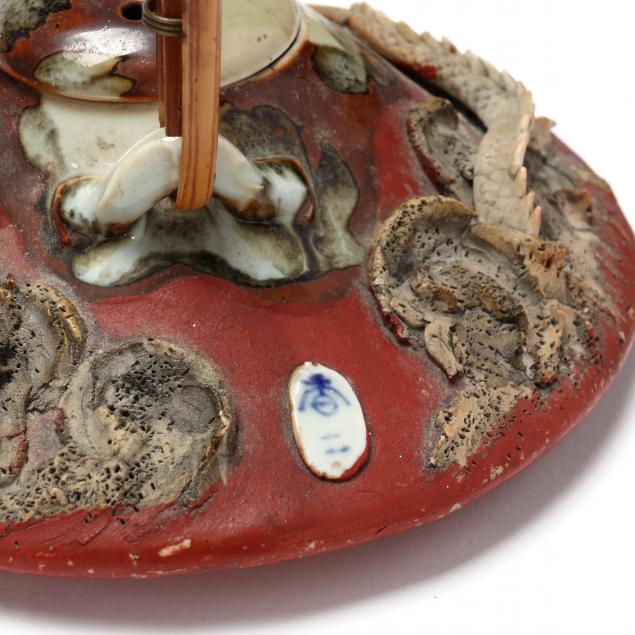 20th century, includes a low circular teapot with dragon (4 3/4 in., 8 in. diameter), fan shaped teapot (5 1/2 in.), censer jar with three feet (3 1/2 in.), two low bowls (2 1/2 in.)