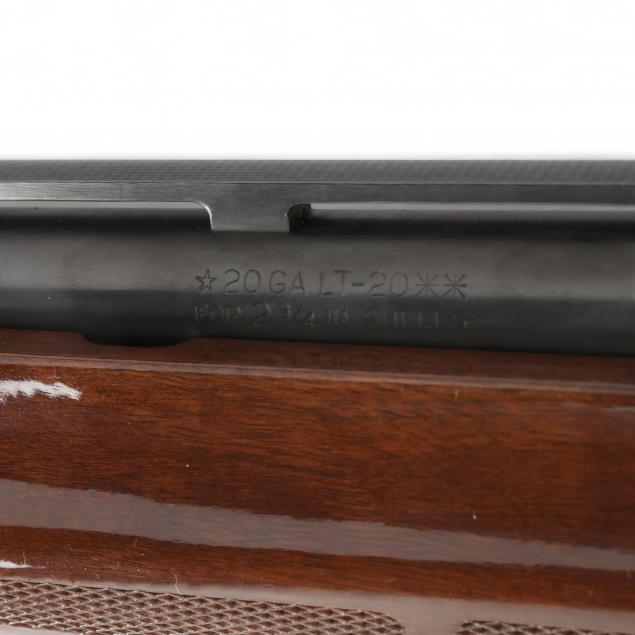 25 5/8 in. blued barrel with ventilated rib marked (STAR) 20 GA LT-20 (two asterisks) / FOR 2 3/4 IN. SHELLS / IMP CYL / REMINGTON ARMS CO. INC. ILION, N.Y. / MADE IN U.S.A.
