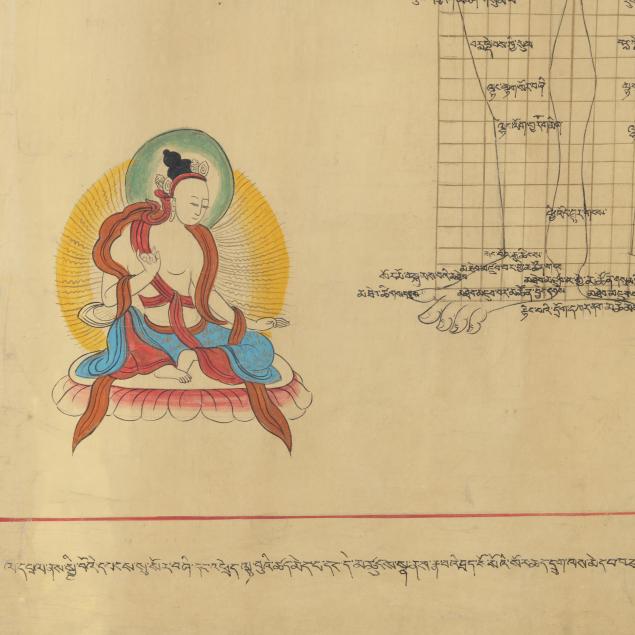 20th century, pigments on a cream colored ground with red borders and labeled in Tibetan with further inscriptions in cartouches underneath, the paintings are based on the ancient eighth century Buddhist text