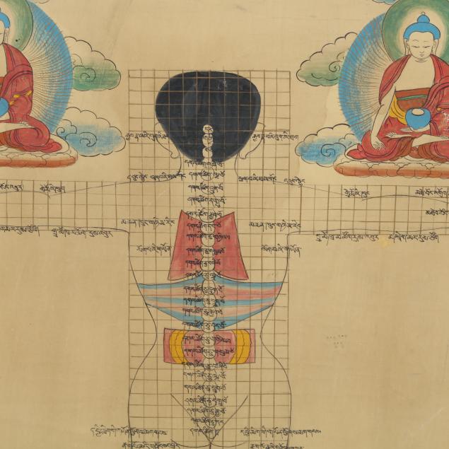 The tree thangka has wear from creases and fraying edges to red border, toning and dirt to surface, some scattered foxing; the second thangka also has wear from creases and fraying edges to red border, light toning, some areas of discoloration, some scattered dirt to surface.