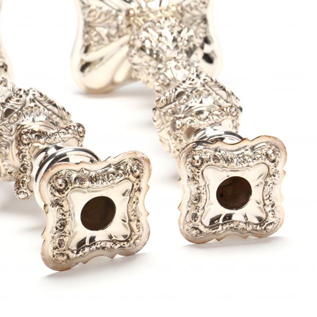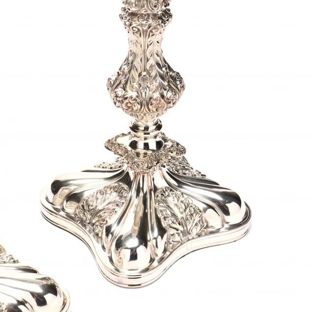 Mark of Ellis-Barker Silver Co., Birmingham, with early 20th century pineapple mark to base, baluster form with ornate acanthus decoration, with removable bobeche and conforming lobed weighted base.