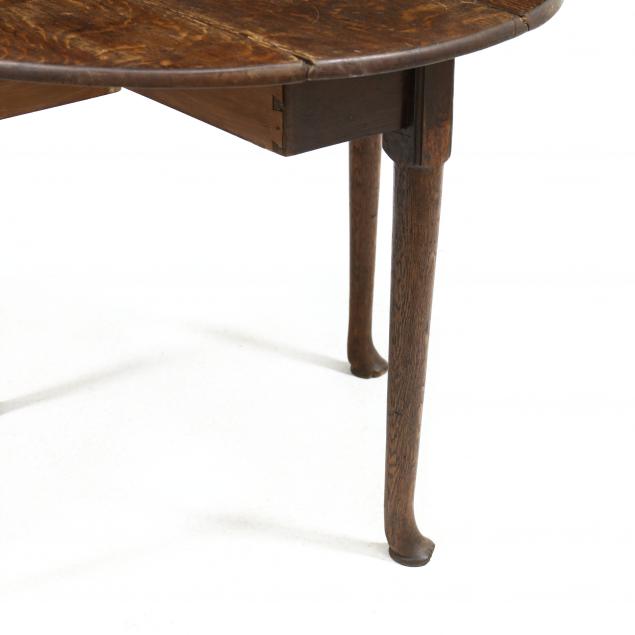 18th century, rectangular top with bowed edges, demilune drop leaf with gate-leg support, molded upper legs, turned tapered leg with pad foot.