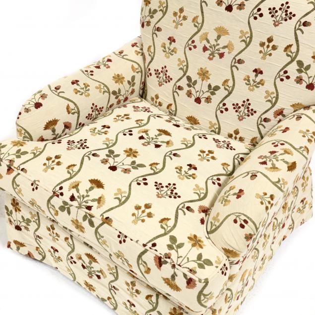 Contemporary, over upholstered form with acorn and thistle motif, slip cushion seat, four throw pillows included, pleated skirt.