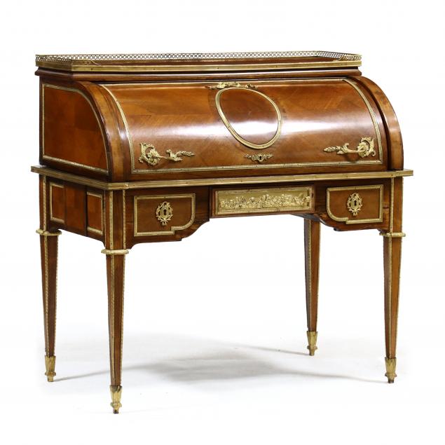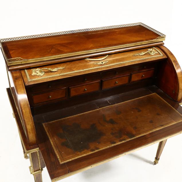 19th century, mahogany veneer, one part form, the upper rectangular top with quad-book-matched panel, applied pierced brass gallery surround, scrolled cylinder with central oval book-matched panel with brass surround and surmounted with ribbon bow, pull-out writing slide with inset leather writing surface and six small drawers, three side-by-side drawers, the center with a gilt cupid panel, all four case sides properly finished with book-matched veneers and ormolu trim, the whole raised on four square tapered legs.