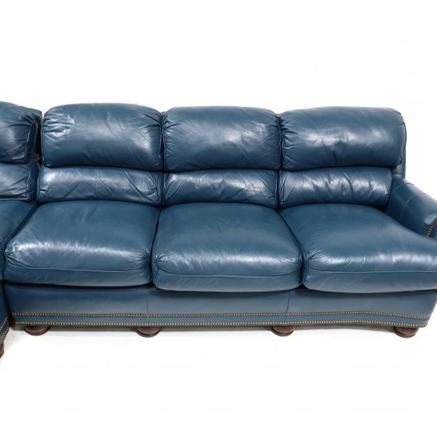 Labeled, late 20th century, three part form, Colonial blue leather with brass tack trim, to include one corner section, two seat sectional with left arm and a three seat sectional with right arm, all with turned tapered wood feet.