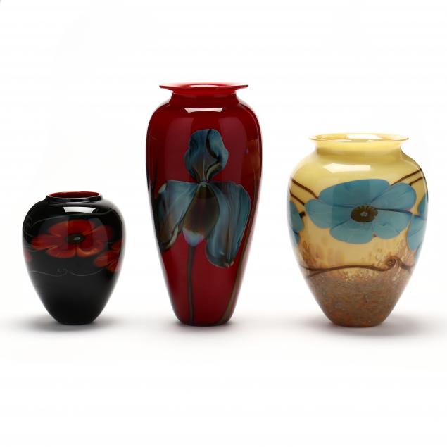 Late 20th century, in three graduated sizes, the tallest with a red field and opalescent iris (11.25 in.), then a mottled custard field with four opalescent blooms (9 in.), and the smallest is black over red cased field with four red blooms (6.25 in.), signed.