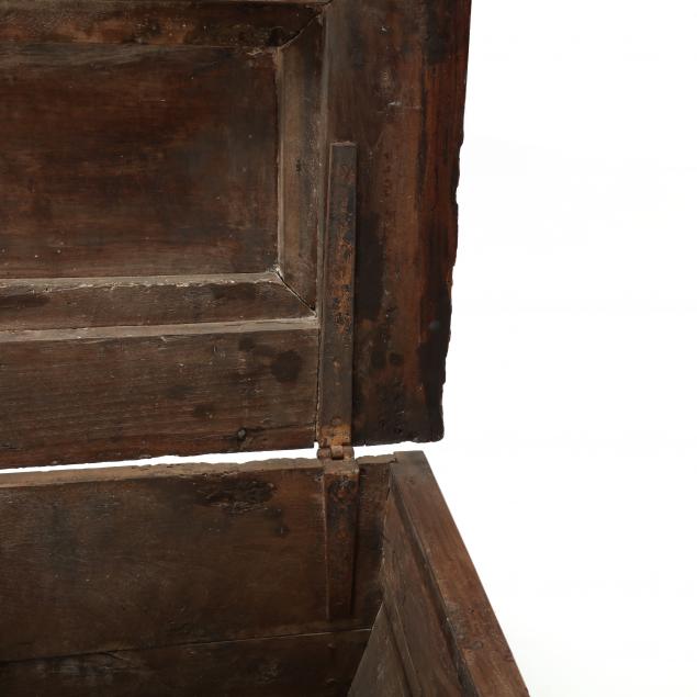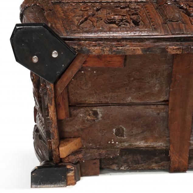 17th century, the sarcophagus form featuring a molded and raised hinged lid with relief carved edge, strap hinges, open interior, the case featuring relief carved caryatids, central cartouche, male and cherub allegorical figures, carved and scalloped skirt, paw feet.