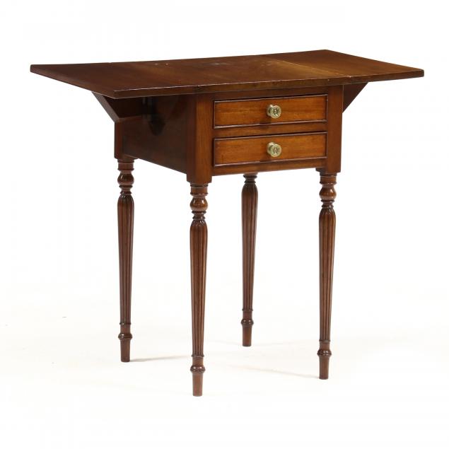 Early 19th century, mahogany veneer, cherry, poplar, white pine secondary, rectangular top, rectangular drop leaves with butterfly support, two drawers with cock beading, turned tapered and reeded legs.