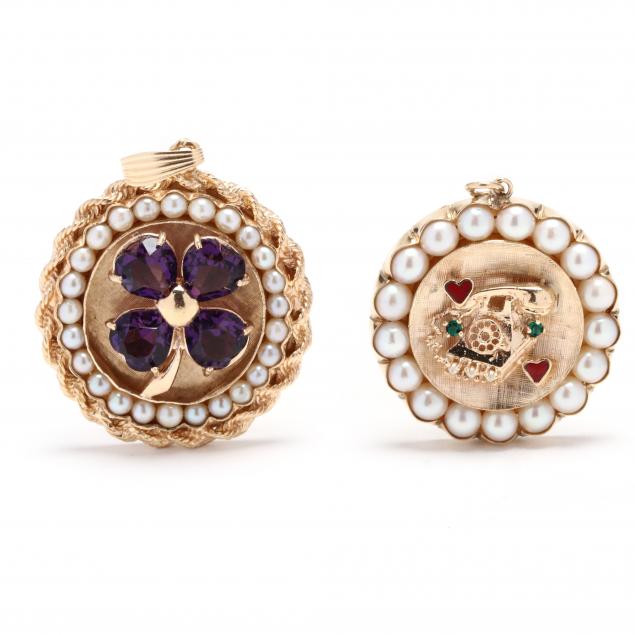 The first in a four leaf clover motif set with heart cut amethysts encircled by pearls and with a rope twist border, stamped 14K and with a maker's mark (1 7/16 in.); the second in a scalloped circular form in a telephone motif with color gemstones to center on a textured gold ground and framed by pearls, testing 14KT.