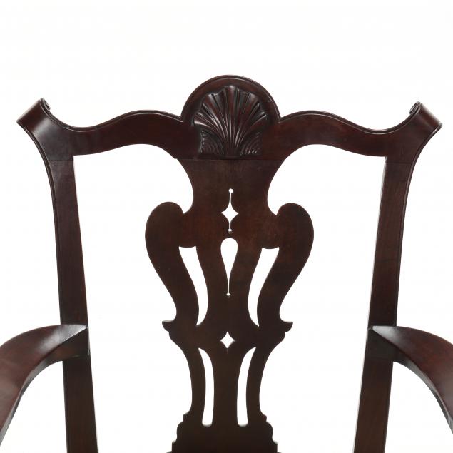 Attributed to William Savery (1721-1787), Philadelphia, circa 1760-1770, shaped shell carved crest with scrolled ears, pierced transitional vasiform splat, shaped arm and arm support with scrolled knuckle, slip seat, seat rail with central drop, cabriole legs with shell carved knee and raised stocking foot, rear stile with double through mortise and tenon construction and chamfered rear down swept legs.
