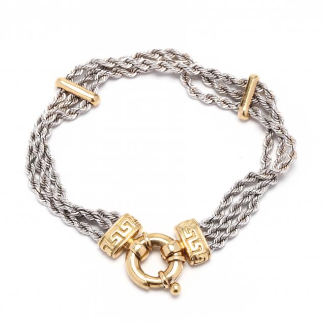Bracelet consisting of three white gold twist strands with gold bar spacers and terminating in yellow gold terminals with Greek key motif and a yellow gold ring clasp stamped 18K Italy.