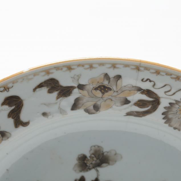 Late 18th century, porcelain hand painted in shades of black and gilt with flowers, fruit, and antique Chinese vessels and vases, gilt diaper border, brown glazed rim.