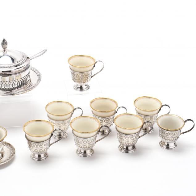 Private Collection, Charlotte, North Carolina Some saucers with minor denting and warping to rims; hammered demitasse cups with warped handles, missing (2) porcelain inserts; pierced demitasse cups with scattered use wear, missing (1) porcelain insert; Caviar set in good estate condition.