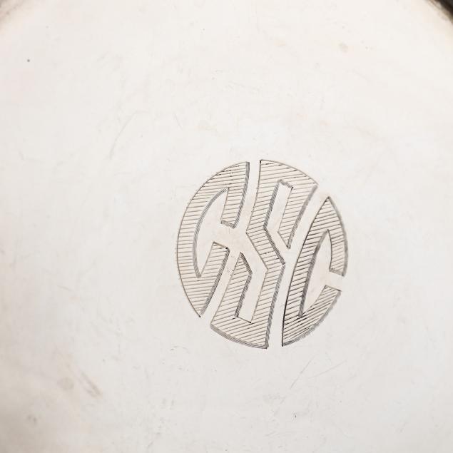 Including a round plate with mark of Reed & Barton, pattern X478, floral and shell rim motif, verso with 1947 dedication engraving (9 1/2 in.); the second a round plate with mark of Towle, pattern number 54690, with reticulated and foliate pattern rim (9 in.); the third a Wallace