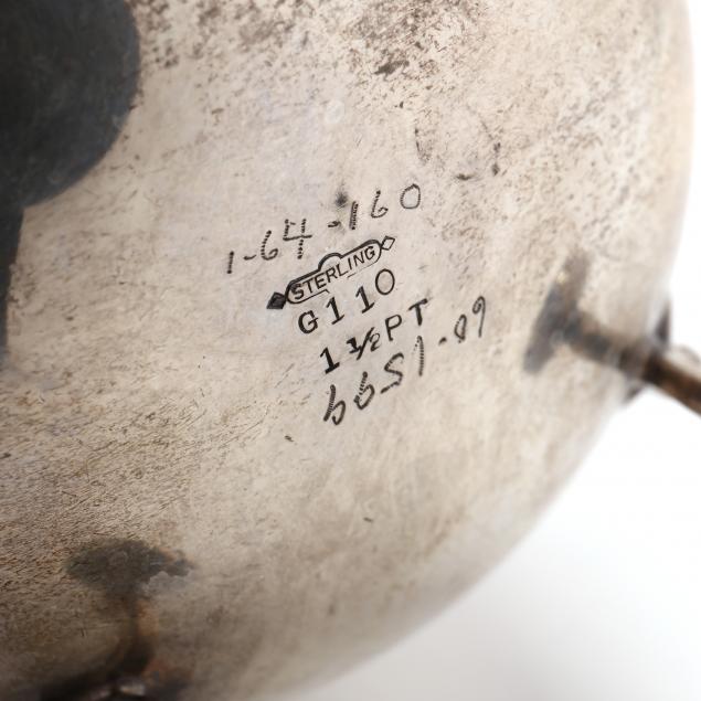 20th century, including a baluster form coffee pot with mark of Graff, Washbourne & Dunn, with scrolled wood handle raised on scrolled legs and floral feet, 1 1/2 pint capacity (8 3/4 in); a creamer and open sugar marked Georg Jensen Inc. USA, with matching hoof feet and shaped rim (4 1/4 in. tallest). All with matching intertwined monogram to body.