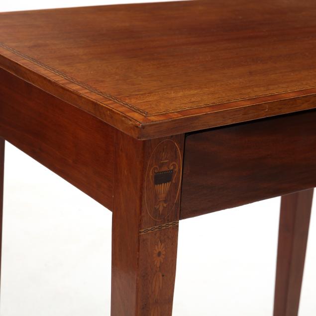 Attributed to New York, circa 1810, mahogany and white pine secondary, one board top with distinctive inlaid motif and banded border at edge, single flush drawer with central inlaid oval with eagle and snake, upper stiles with inlaid urn above repeating distinctive inlaid motif, tall square tapered legs, the front with a graduated bellflower inlay.