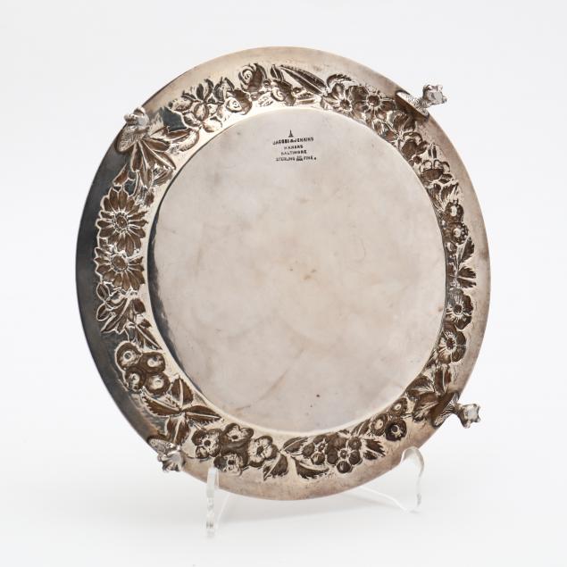 Baltimore, circa 1910, diapered tray service with script monogrammed wreath cartouche, within a floral repousse rim, raised on ball and talon feet.