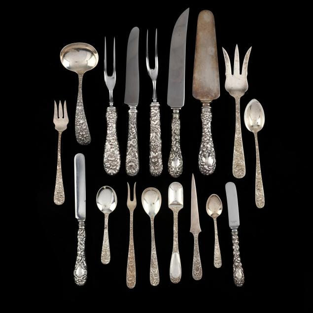 (61) total pieces to include: (8) dinner knives (8 5/8 in.), a sterling handled cake server, carving knife, master butter knife, and butter spreader in the same pattern, all with script monogram "ECF" to handle; (2) dinner knives (9 in.), a fork (6 1/4 in.), (2) teaspoons (5 3/4 in.), a five o'clock teaspoon (5 1/2 in.), an iced tea spoon, (2) fruit spoons, (10) flat handle butter spreaders, (6) oyster/seafood forks in varying sizes, (3) demitasse spoons, (2) sugar spoons, (2) lemon forks of varying sizes, a lettuce fork, a large carving fork (8 3/4 in.), a youth spoon, and a letter opener in the S. Kirk & Son